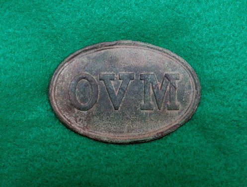 152. Absolutely beautiful face on this excavated, large size, lead-filled, "OVM" (Ohio Volunteer Militia) cartridge box plate.  This cartridge box plate was recovered about 40 years ago from an Ohio Infantry camp located near Decherd, Tennessee.  I actually dug a matching OVM buckle to this box plate about 50 feet away.  This will be a centerpiece to someone's Ohio display.--$2,450.
